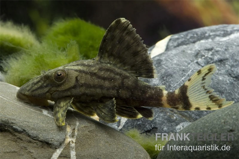 Der wunderschöne Grüne Panaque oder lateinisch L191 Panaque sp. stammt aus Südamerika. Er lebt dort offenbar hauptsächlich in Kolumbien. Er gehört zur vielfältigen nigrolineatus-Gruppe. Vermutlich lautet seine korrekte wissenschaftliche Bezeichnung L191 Panaque cf. suttonorum green. Sehr auffällig bei diesem schönen Wels ist das hübsche Muster, das bei Jungtieren etwas ausgeprägter ist. Der Körper ist dunkel, mit vielen hellen gelblichen Streifen, die nicht klar abgegrenzt sondern leicht verwaschen sind. Dieser schöne L-Wels hat viele Namen: Grüner Panaque, Broken line Royal Pleco, Dull-Eyed Pleco, Grüner Holzfresser.