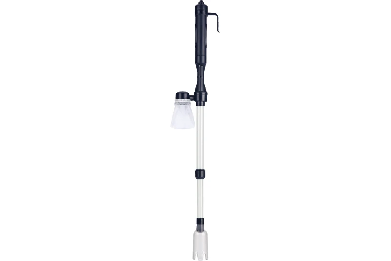 ist ein praktischer Mulmsauger mit dessen Hilfe Sie Schmutz ohne großen Aufwand vom Grund Ihres Aquariums entfernen können. Der angesaugte Mulm wird im angeschlossenen Filterbeutel gesammelt und kann von dort sicher entsorgt werden. Oder Sie schließen den im Lieferumfang enthaltenen Schlauch (Länge ca. 77 cm) an, um das Schmutzwasser vollständig zu entfernen.