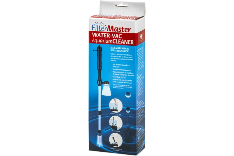 Durch sein verstellbares Teleskoprohr eignet sich der Water-Vac für Aquarien mit einer Wassertiefe von 20 bis 60 cm. Der Sauger gewährleistet einen Wasserdurchfluss von 520 l/h und ist durch kabellosen Batteriebetrieb (2 x Typ C / LR14 Baby) mobil und überall einsetzbar. Batterien sind nicht im Lieferumfang enthalten.